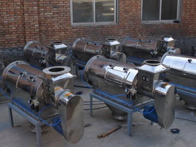 本設備篩網為圓筒狀,置于機體內,物料通過螺旋輸送系統后,和氣流混合、霧化進入網筒內;通過網筒內風輪葉片使物料同時受離心力和旋風推進力,從而迫使物料噴射過網,由細料排出口排出,不能過網的物料沿筒壁從粗料排出口排出。